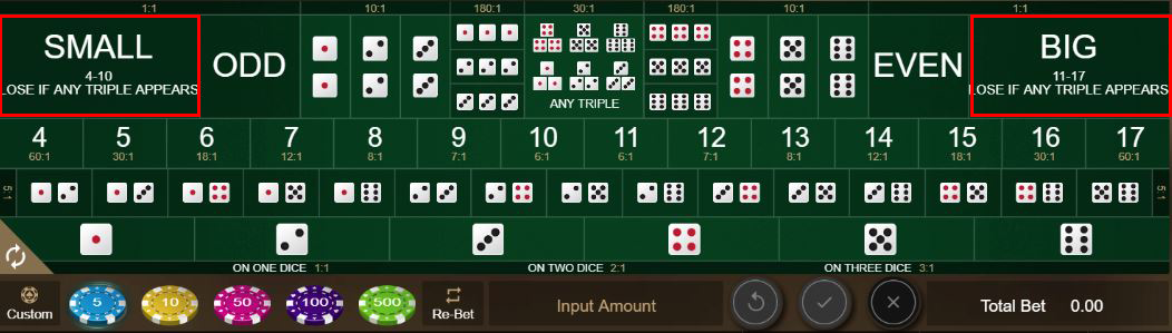 Two of the most popular Sic Bo bets are the bets on Small and Big. These bets predict that the total of the three dice will be Small (4 to 10) or Big (11 to 17).